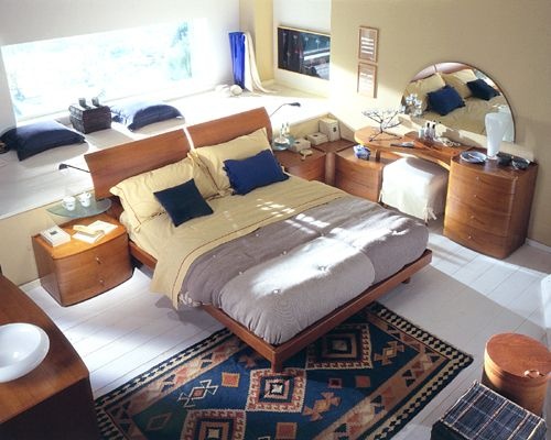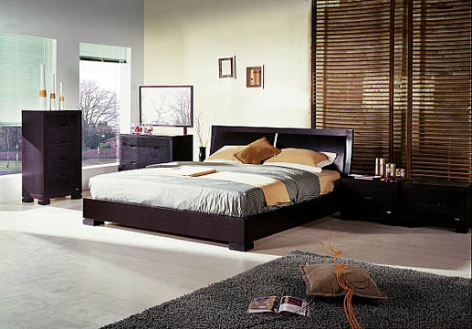 Идеальным решением станет ортопедический матрас. Сама же кровать, в большинстве случаев двуспальная, украшена изящной резьбой (классический стиль), либо представляет собой «деревянный ящик с выдвижными полочками» с высоким матрасом. Спинка и различные декоративные украшения на такой кровати отсутствуют. При этом выдвижные ящики вполне заменяют тумбочки. Таким образом, вся обстановка в спальне сводится к единственному предмету – кровати.
